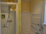 Das Bad wird sowohl über einen normalen Heizkörper (nur im Herbst/Winter) als auch über eine separate Bodenheizung beheizt.